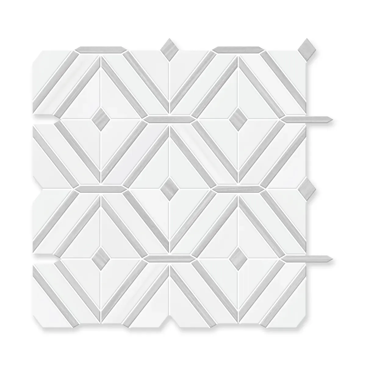 HIGH GROVE IS A WATERJET AND HAND-CUT MARBLE MOSAIC BY SPECIALLY TRAINED ARTISANS. SHOWN IN BIANCO DOLOMITE AND GLACIER GREY.